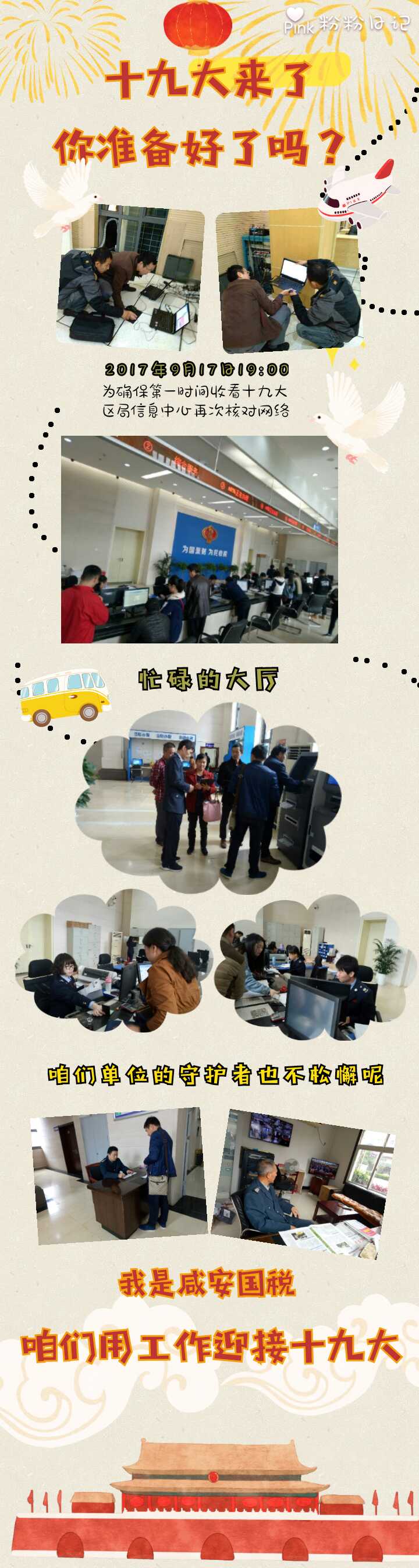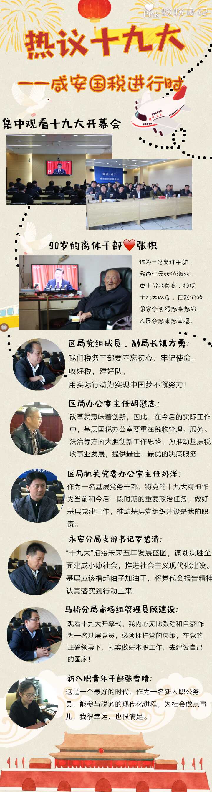 上午8:45,身着税服、佩戴税徽的干部职工陆续到达三楼会议室,静候十九大开幕式的到来。同每期的主题党日学习一样,本次的电视直播也是各个支部、各个分局同步收看,在微信群实时交流共享观看图片、收听心得。 潘桂霞是崇阳县国税局办税服务厅主任,也是全市国税系统3位咸宁市党代表之一,正值申报期内,她无法坐在休息室安静地听完报告,只得抽空往墙上的电视屏幕瞅一眼。“随着网上办税服务厅正式运行,越来越多的纳税人感受‘马上办,网上办,一次办’等便利,切身体会到党的十八大以来,办税模式改革带来的巨大变化。”潘桂霞感慨地说:“我将立足本职,勇于担当、主动作为,以增强纳税人的满意度和获得感为己任,全力落实各项改革措施,更加优质、高效地服务好纳税人,以实际行动迎接党的十九大胜利召开。” 县局局长戴新表示:“我为国家升腾不息的发展气势而自豪,为充满生机与活力的未来而自信满满,但也更清醒地认识到自己肩负的责任。”“作为基层国税机关的负责人,要坚决依法收好税,坚决不收过头税,坚决落实减免税,坚决打击涉嫌虚开增值税专用发票案件;继续深入开展营改增政策大辅导,有针对性地帮助纳税人用好抵扣政策,更好享受减税红利;要持续开展便民办税春风行动,进一步推动对纳税人的大服务,多推便民之举,多施利民之策,切实提高纳税人满意度和获得感。” 通山县局