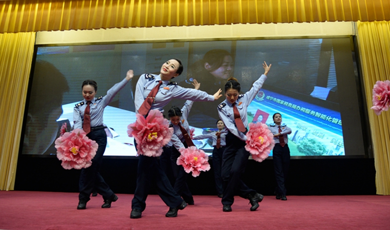 冯小刚导演的电影《芳华》让许多人回想起曾经的青春岁月,而一部真实版《芳华》正在国税上演。3月6日,咸宁市国税局女干部代表全省国税系统,参加湖北省纪念“三八”国家劳动妇女节108周年大会,登台表演了歌舞朗诵节目《税务蓝 一生情》,向全省女同胞致敬献礼。 活动现场,咸宁市国税局女干部参演的税务版“芳华”,展示了湖北国税女税官的家国情怀,获得参会代表的高度评价。大家纷纷表示,获奖代表们生动诠释了新时代女性自尊、自信、自强、自立的“四自”精神,将以她们为榜样,为湖北国税高质量发展奉献巾帼力量。 会上,全省国税系统6个集体和3名个人获得荣誉表彰。其中,咸宁市国税局进出口税收管理科、赤壁市国税局办税服务厅被表彰为湖北省“巾帼文明岗”,咸宁市高新技术产业园区国税局征管科科长戴敏同志被表彰为“巾帼建功标兵”。