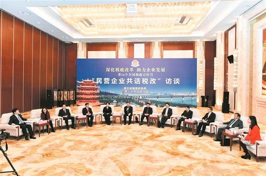 | | “民营企业共话税改”访谈 | 这个4月,恰值第26个全国税收宣传月,本次宣传月的主题是“深化税收改革、助力企业发展”。4月6日上午,6位分别来自地产、建筑、金融、证券、餐饮和制造业的湖北民营企业家代表,以及财税专家、媒体记者齐聚湖北武昌,参加由湖北省国税局举办的“民营企业共话税改”访谈活动,畅谈“营改增”(营业税改征增值税)改革红利,纵论税收改革发展大势,共同探讨如何更好地发挥税收对民营经济发展的促进作用。 | | 访谈时间:2017-04-06 09:00:02 | | 主题嘉宾:湖北省国家税务局党组书记、局长:胡立升 , 湖北省国家税务局党组成员、副局长:柳现青 , 湖北省国税局党组成员、副局长:郑克俭 | |